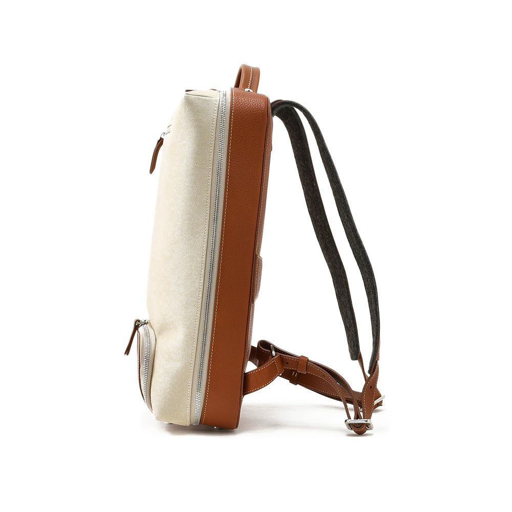 撥水加工を施したコットンキャンバスをメインに、しなやかなセミベジタブルタンニンレザーを組み合わせた、洗練された素材構成が魅力です。フランスで繊細に織り上げられたコットンツイルキャンバスは、軽量ながらも耐久性に優れ、上品な表情を保ちながら日常使いに頼れるタフさを発揮します。