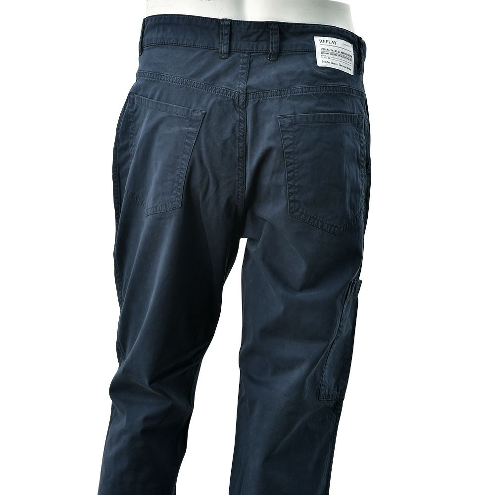 リプレイ REPLAY コットンパンツ メンズ ストレッチツイル生地 ウエスト調節可能バックル ダークブルー ガーメントダイ カーペンターパンツ レギュラーシルエット カーゴ型ポケット 国内正規品 でらでら 公式ブランド