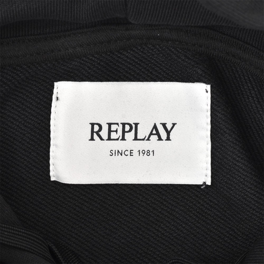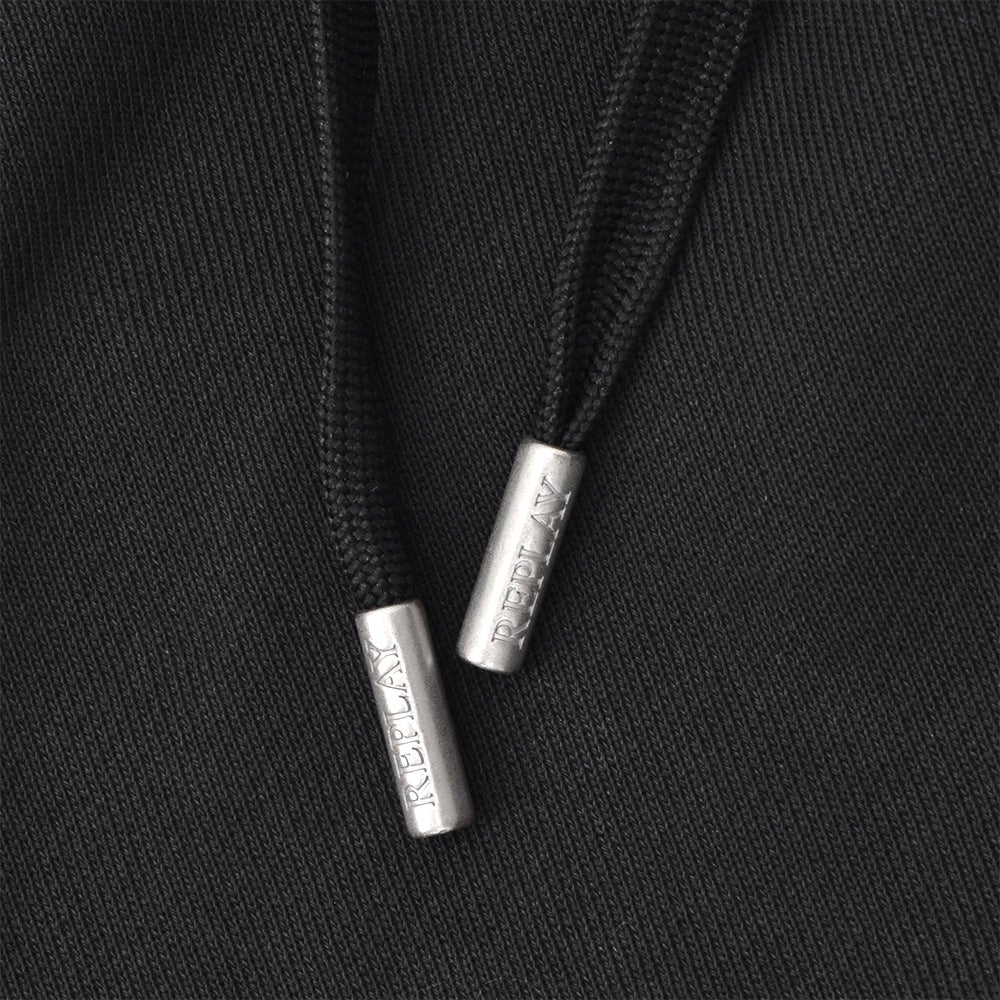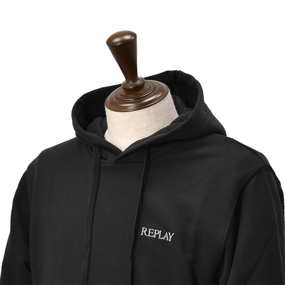 リプレイ REPLAY プルオーバーパーカー メンズ フーディースウェットシャツ コットンテリー素材 ブラック 黒 ブランドロゴ刺繍 裏パイル ドローコード付き 国内正規品 でらでら 公式ブランド