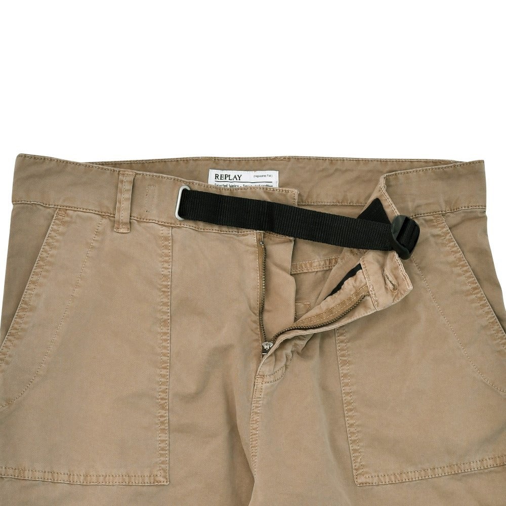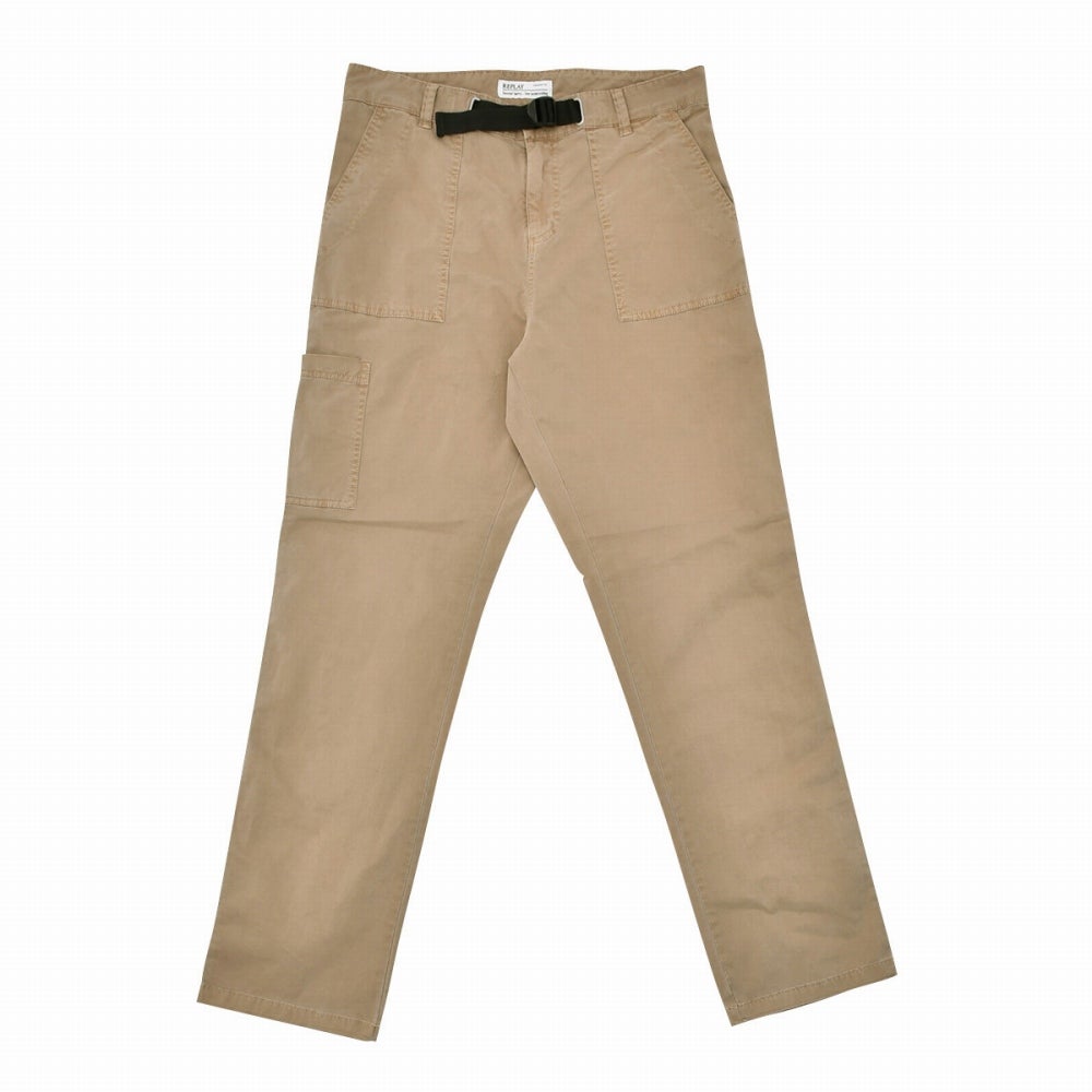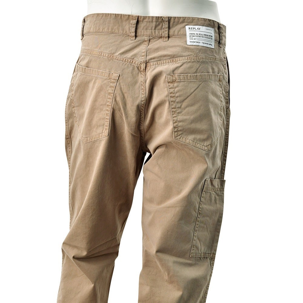 リプレイ REPLAY コットンパンツ メンズ ストレッチツイル生地 ウエスト調節可能バックル ブラウンベージュ ガーメントダイ カーペンターパンツ レギュラーシルエット カーゴ型ポケット 国内正規品 でらでら 公式ブランド