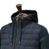 HERNO / ヘルノ の、旅をキーワードとしたHERNO RESORTコレクションより、ハイブリッドフーディーブルゾンが登場。フェイクスウェードにダウンを封入した前身頃と、ミドルゲージのウールニットの後ろ身頃と袖という、相反する素材感で仕立て上げた、贅沢なライトアウターです。