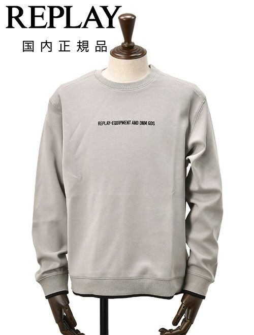 リプレイ REPLAY 長袖トレーナー メンズ スウェットシャツ コットンポリ 3者混生地 グレー クルーネック レタリングロゴ刺繍 ストレッチ リブ配色デザイン 国内正規品 でらでら 公式ブランド