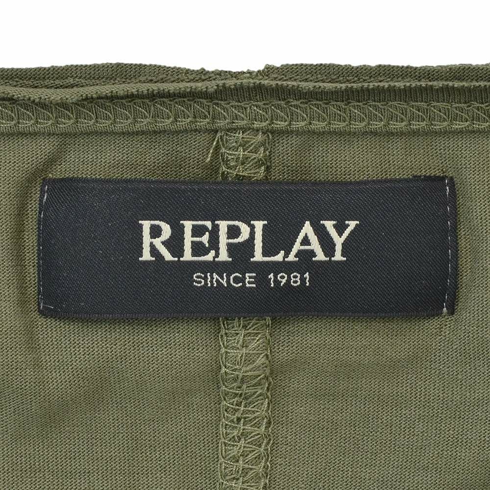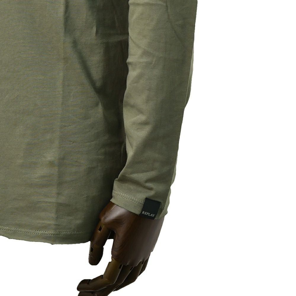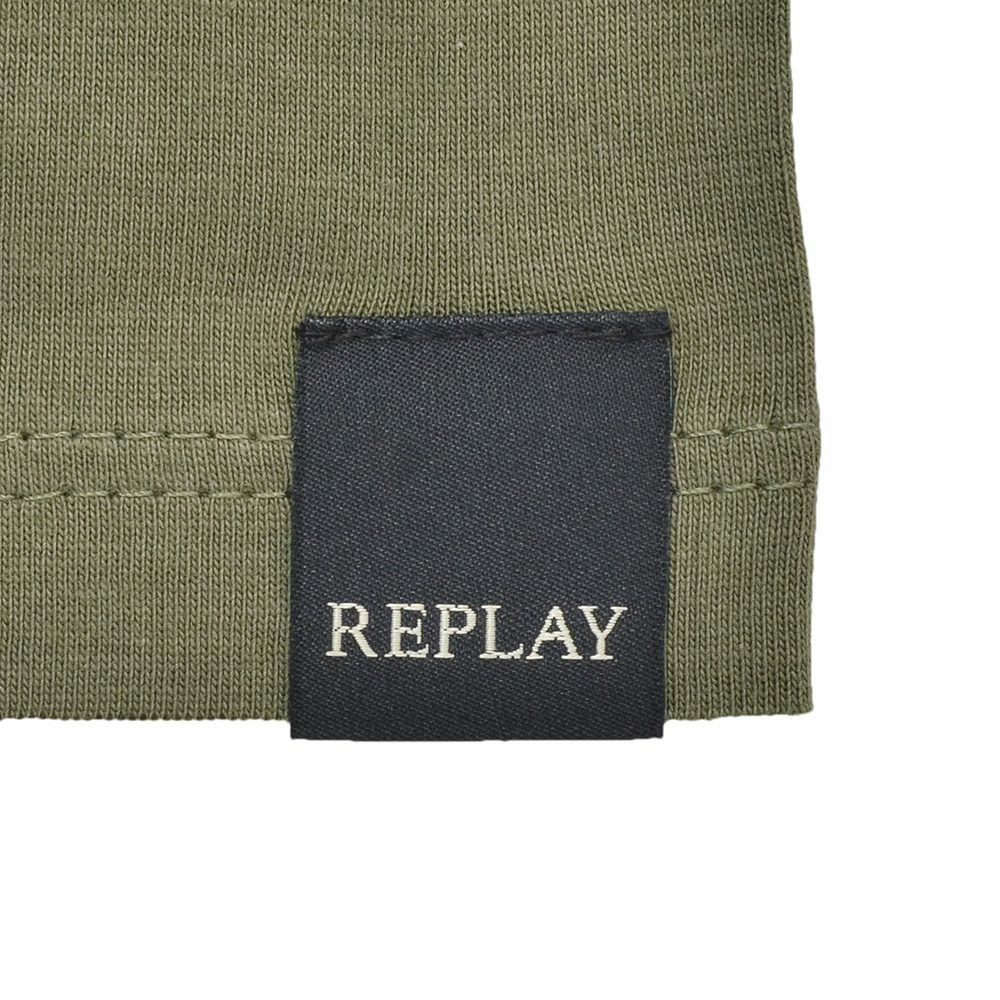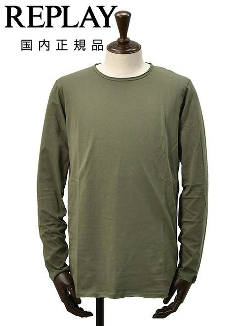 リプレイ REPLAY 長袖Tシャツ メンズ クルーネックカットソー ダメージ風デザイン コットン 綿100% オリーブ 左袖ブランド織りタグ 薄手仕様 レギュラーシルエット 国内正規品
