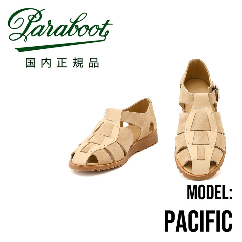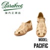 甲の上を太めの幅感でざっくりと大胆に編み上げたデザインが涼しげで、PASIFIC=太平洋と名付けられている通り、広い海の様な開放感と爽やかさに溢れたレザーサンダルです。この指先が飛び出さない、サイドからぐるりと編み込んだアッパーが、歩きやすさを叶えたサンダル。