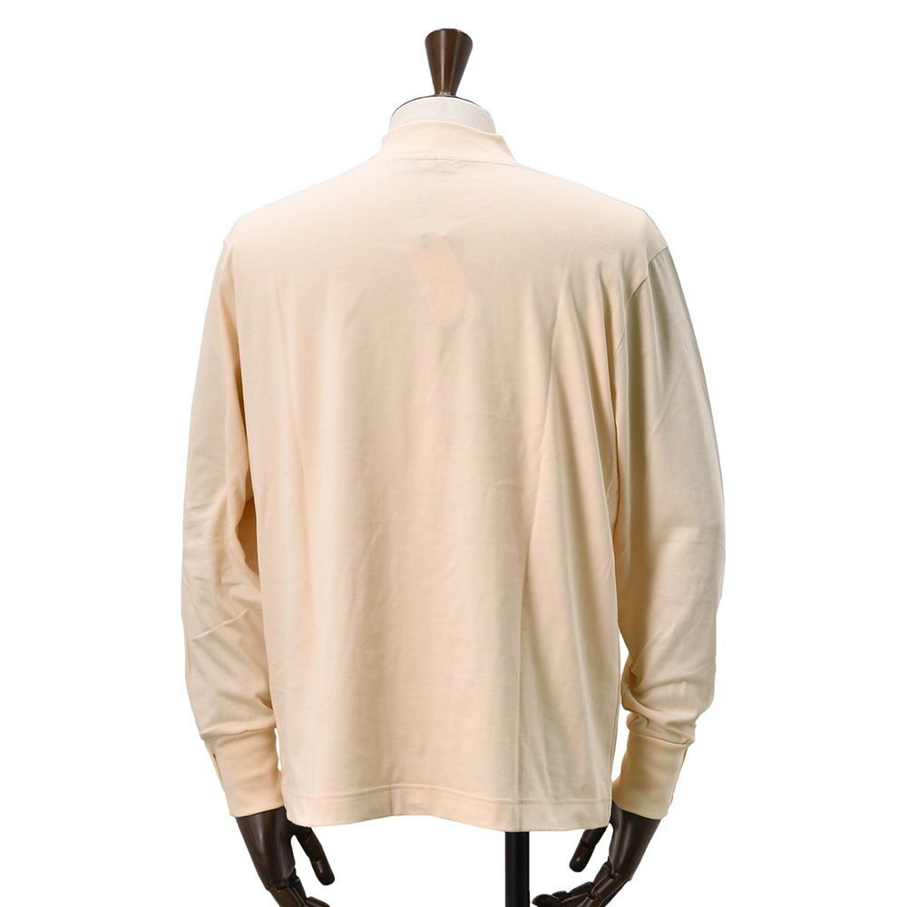 タートルネックより抜け感があり、クルーネックより上品な雰囲気のモックネックカットソー。今までありそうでないエラシオのオリジナルTシャツを是非、お楽しみください。