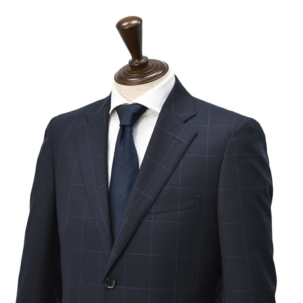 本作は、カノニコを代表する生地の1つでもある「スーパーソニック」を使用したウィンドウペン柄シングルスーツ。