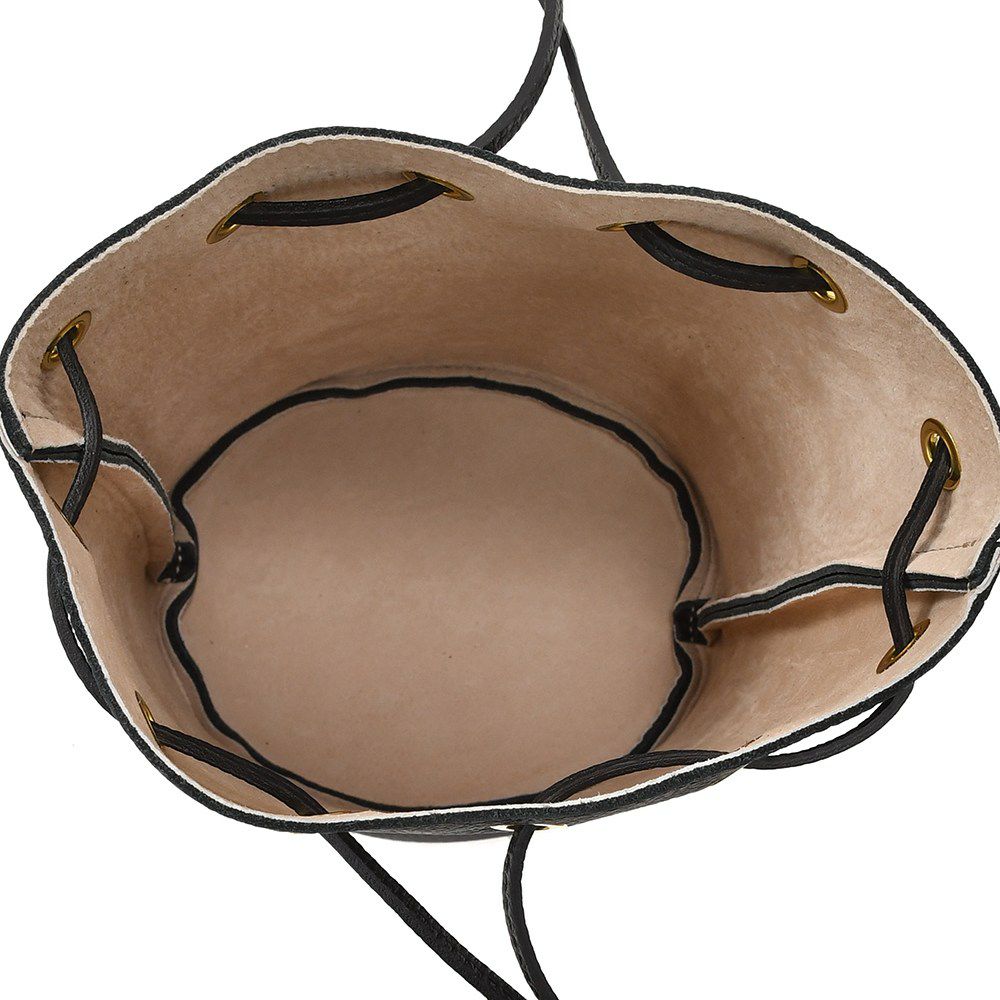 巾着型のフォルムになりますが、高さを持つことでミニバッグとしては珍しい長財布がすっぽり収まりますので、コンパクトな財布な方でなくても使える仕様は嬉しい要素の一つ。また、自立する程のマチ幅をとることにより、厚みのあるものも収めることができるといった収納力も持ち合わせております。
