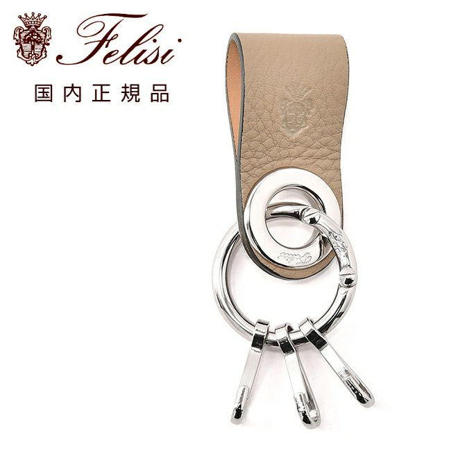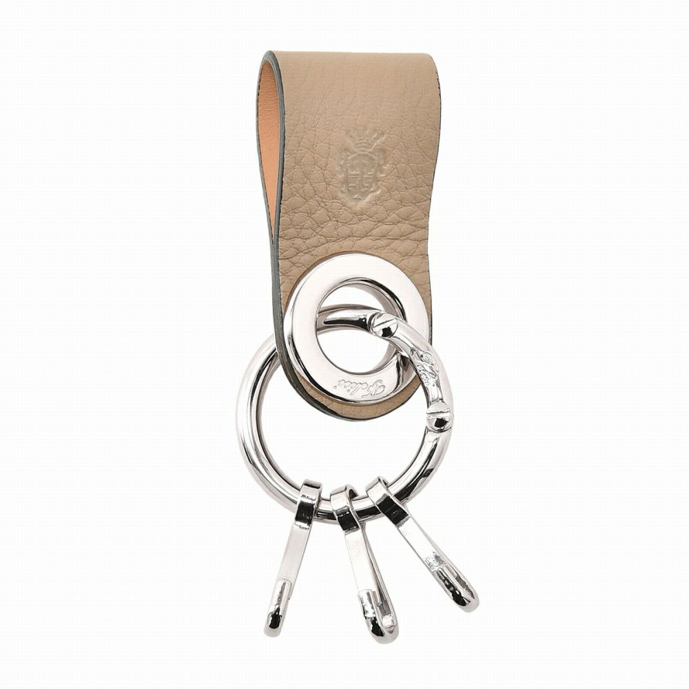 持ち手となるレザーパーツ部分には、フェリージを代表する紋章を刻印し 大きめのハトメ部分にもブランドロロゴを施す等、細部にまで職人ならではの技術を感じられる逸品。太くて頑丈なシルバーリングは、キーフックが簡単に取り外せないようにネジ留めにて固定されております。揺れた時にキーリングの軽やかな音色も印象的です。