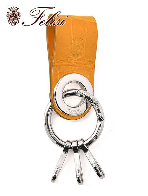 持ち手となるクロコ型押しのレザーパーツ部分には、フェリージを代表する紋章を刻印し 大きめのハトメ部分にもブランドロロゴを施す等、細部にまで職人ならではの技術を感じられる逸品。太くて頑丈なシルバーリングは、キーフックが簡単に取り外せないようにネジ留めにて固定されております。揺れた時にキーリングの軽やかな音色も印象的です。