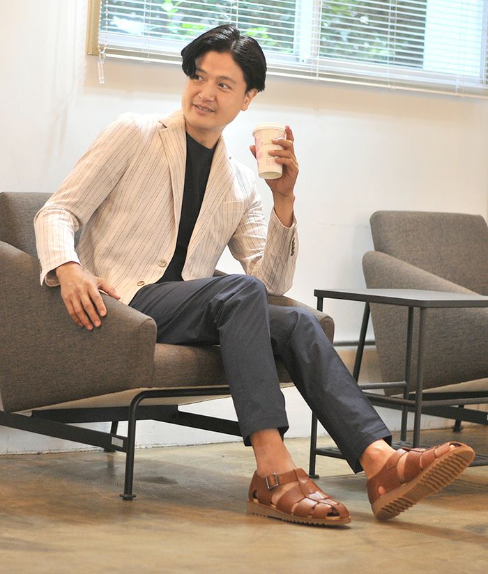 ドレスダウンやリゾートスタイルにおすすめのレザーサンダル。指先が”マル見え”にならず、指先を革紐が