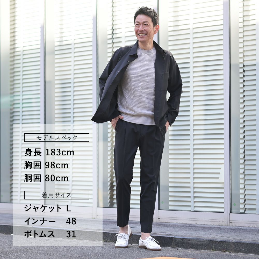 使用されているのは、しなやかでさらっとした滑らかな質感が魅力の平織りのサマーウールに、ポリエステル、ポリウレタンを混紡した三者混生地。こちらの生地は、洗えるウォッシャブルウールであり、皺にもなりにくい素材ですので、アイロン入らずで楽しめる高機能性を持ち合わせたトロピカルウール生地になります。