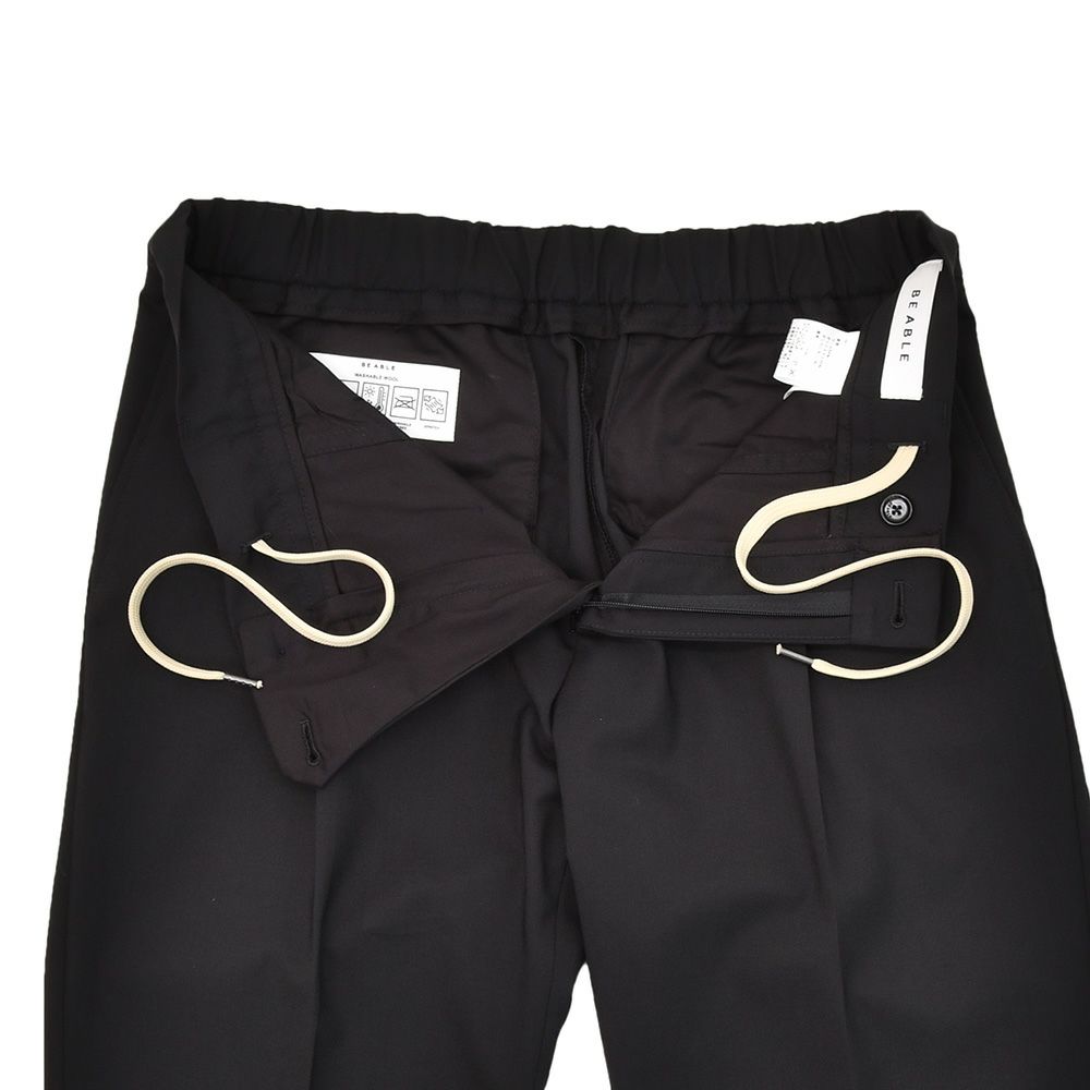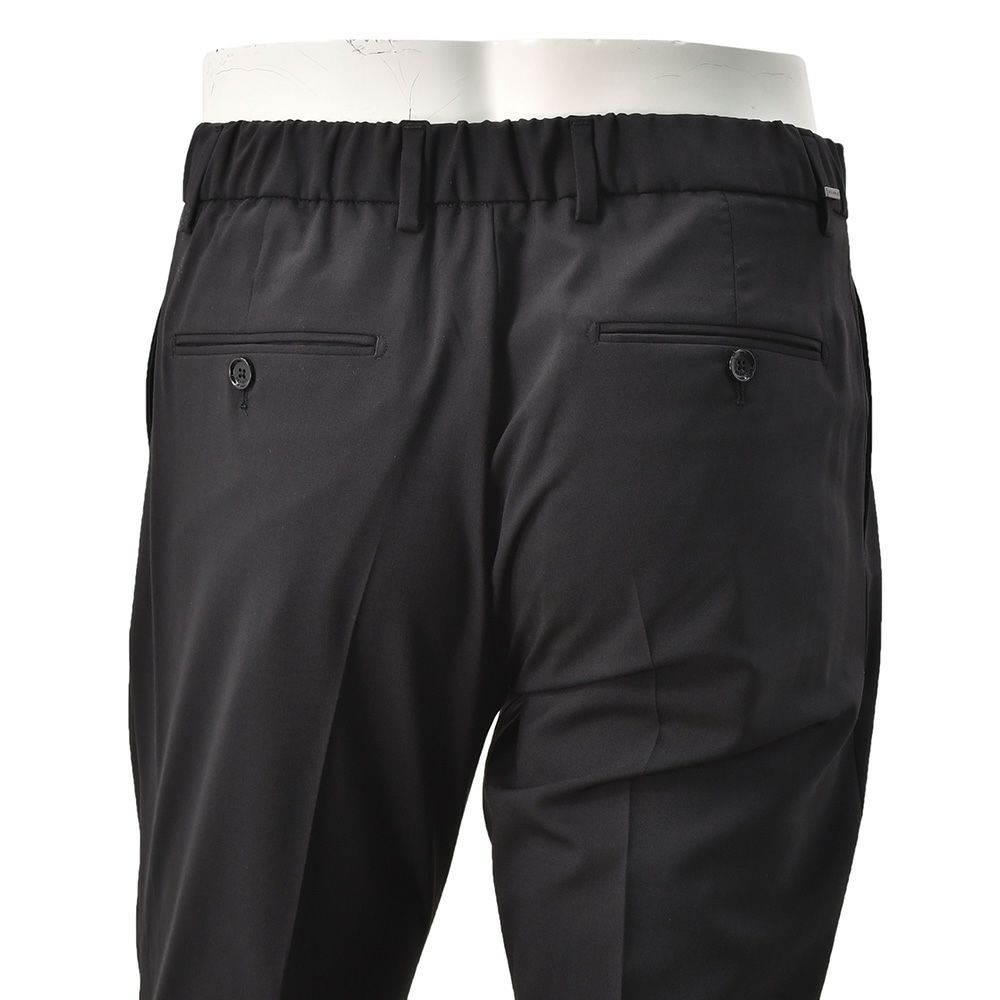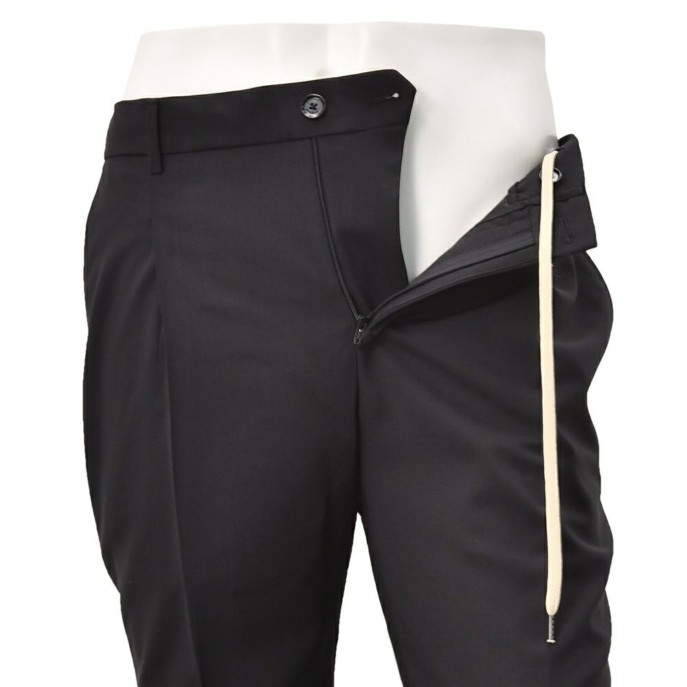 RICCARDOモデルのデザインは、1プリーツを採用したウエストバックシャーリングであり、内側にはドローコードを施したイージー仕様のスラックスになります。フロントは2点留めフロントであり、スポーティな仕様ながら、腰周りが前から後にかけてカーブするようになっており、本格トラウザーズに近しい設計が魅力です。