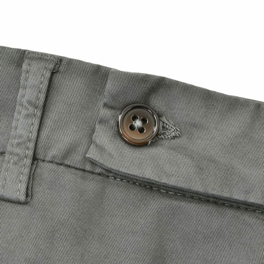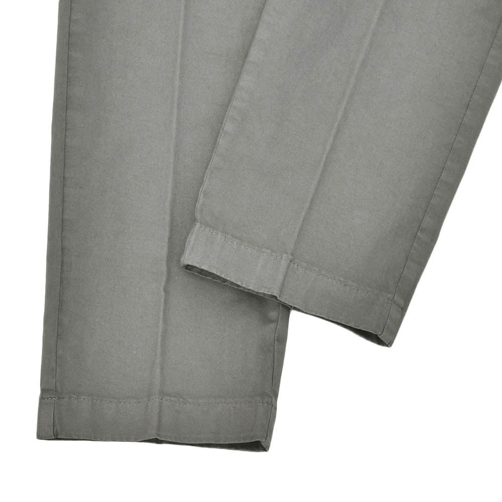 ノープリーツ仕様のスッキリとしたフィット感に加え、ジップフライ仕様の3点留めフロントを採用した安定感のある腰周りを再現した一着。スラントポケットを採用するなど、エレガントな表情を作り出したチノスラックスになりますが、股上が深めに設定され、ウエスト部分には屈んだ時にストレスを感じないVスリットなどを施すことにより、ウエスト周りの抜群のフィット感とスリムなのに窮屈さを感じさせないノンストレスで履く事が出来る魅力的なパンツに仕上がっております。
