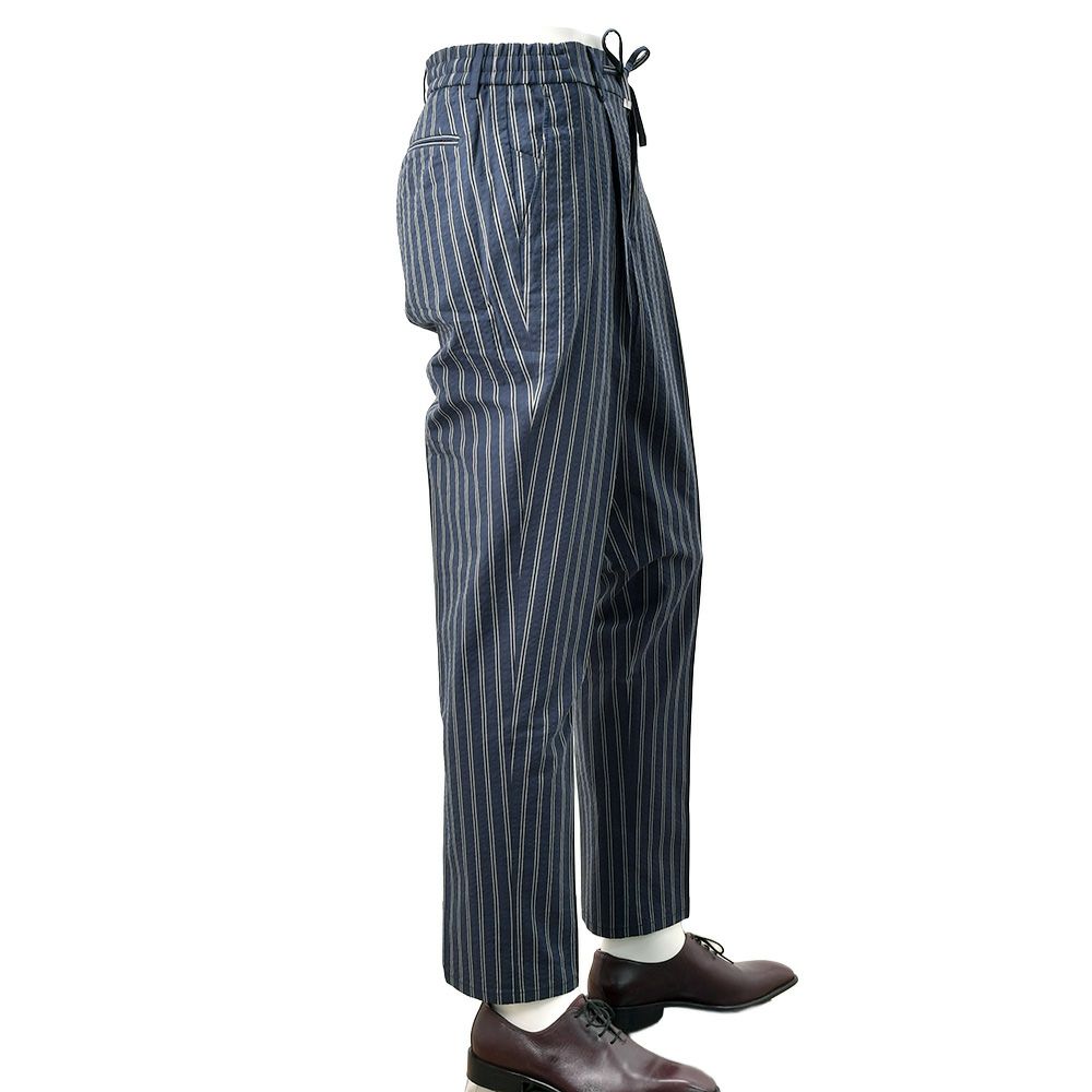 こちらは、BERWICH / ベルウィッチより届いた、シーズンの装いを軽やか且つスマートに仕上げる"SAKE 1P GYM / サケ ワンプリーツ ジム”モデルの最新作。ブランドが得意とする品格あるパンツメイキングを土台に、シアサッカーならではの清涼感とストライプ柄の軽快な表情を掛け合わせた、季節感豊かな一本。視覚的にも涼しげで、蒸し暑い時期でも快適さを印象付けます。