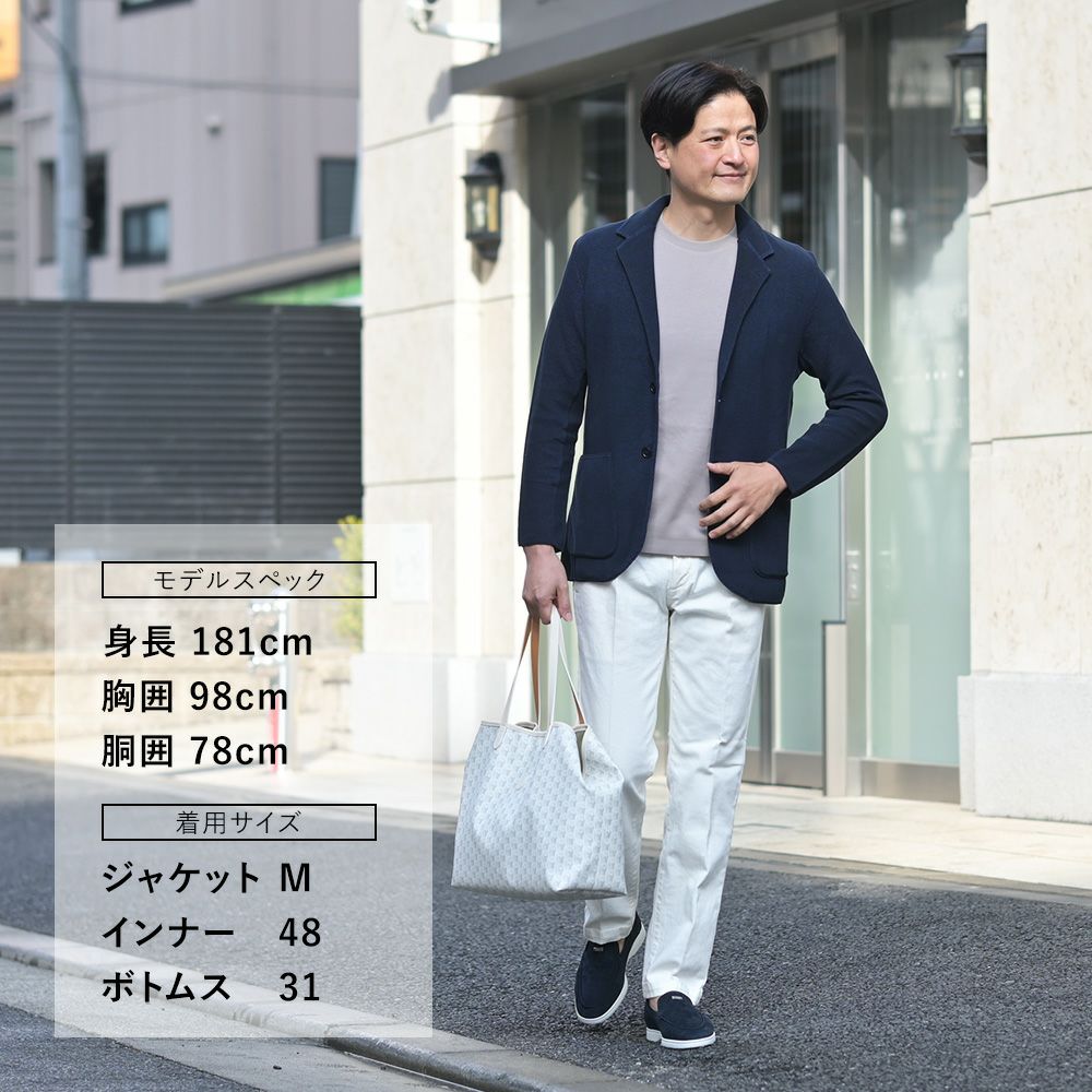 そして、コットンニットによる柔らかなイメージと、腰パッチポケットのカジュアルさとが相まって、カチッとした印象の強いジャケットの存在感も、格式張らないソフトなテイストに。デイリーなお洒落へも気軽に取り入れやすく仕上がりました。