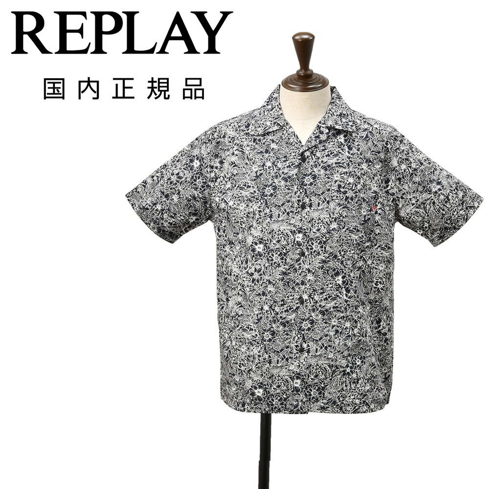 リプレイ REPLAY 開襟シャツ メンズ 半袖アロハシャツ コットンポプリン ネイビー×ホワイト ボタニカル柄プリント オープンカラー リラックスフィット 国内正規品 オクテット名古屋