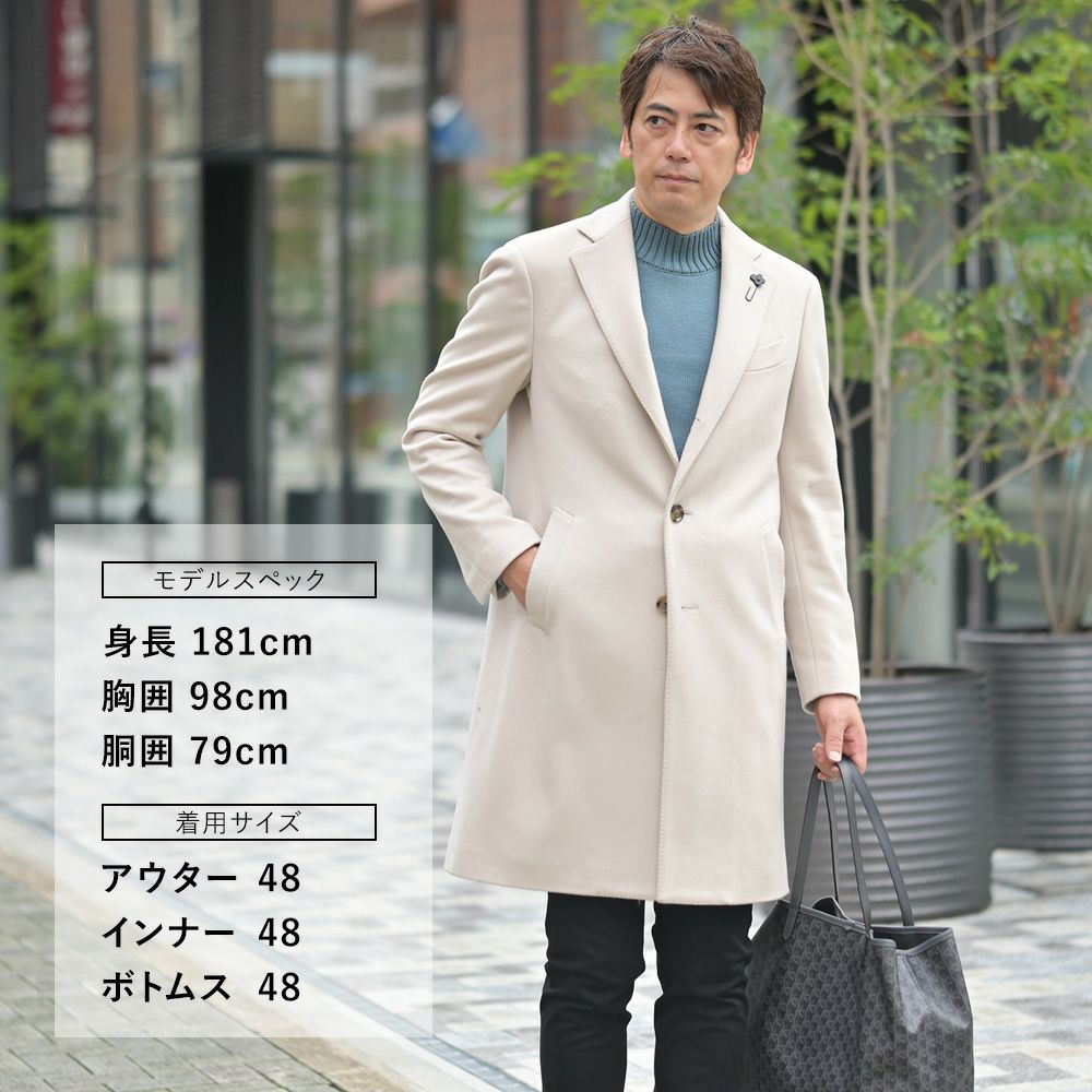 そんなラペルと、コートの着丈に対してバランス良く並んだ3つボタンと、段返りシングル仕立てのフロントは、プレーンさを引き立てた穏やかな表情を描き上げていて、全体的にぐっとモダンなフェイスに仕上がりました。