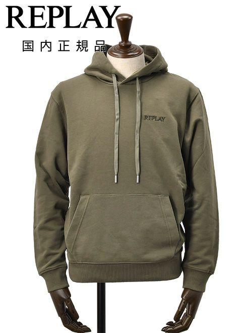 リプレイ REPLAY プルオーバーパーカー メンズ フーディースウェットシャツ コットンテリー素材 オリーブ ブランドロゴ刺繍 裏パイル ドローコード付き 国内正規品 でらでら 公式ブランド