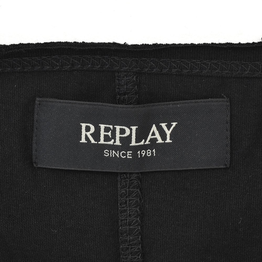 リプレイREPLAY長袖Tシャツメンズクルーネックカットソーダメージ風デザインコットン綿100%ブラック黒左袖ブランド織りタグ薄手仕様レギュラーシルエット国内正規品でらでら公式ブランド