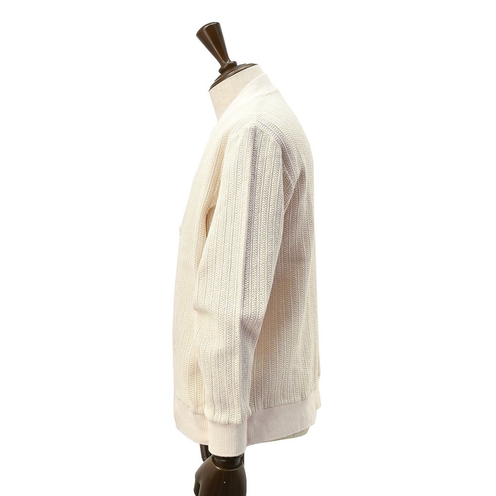 最大の魅力はリブ装飾によりメリハリを利かせている点。全体的にゆったりとした雰囲気でありますが、袖口や裾に幅広のリブを施すことで引き締めてくれますので、綺麗に纏めてくれます。軽い感じで纏うことが出来、リラックス感も持ち合わせたカーディガンのシルエットにもご注目くださいませ。