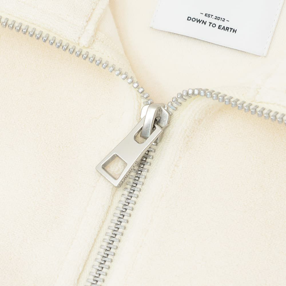 胸元にはブランドのアイコン刺繍をさりげなく配置し、控えめながら存在感を放つアクセントに。襟は立てても折り返しても着用でき、ジップの空き具合でちょっとした表情の変化をつけて、スタイリングの幅を広げてくれる万能なネックデザインです。