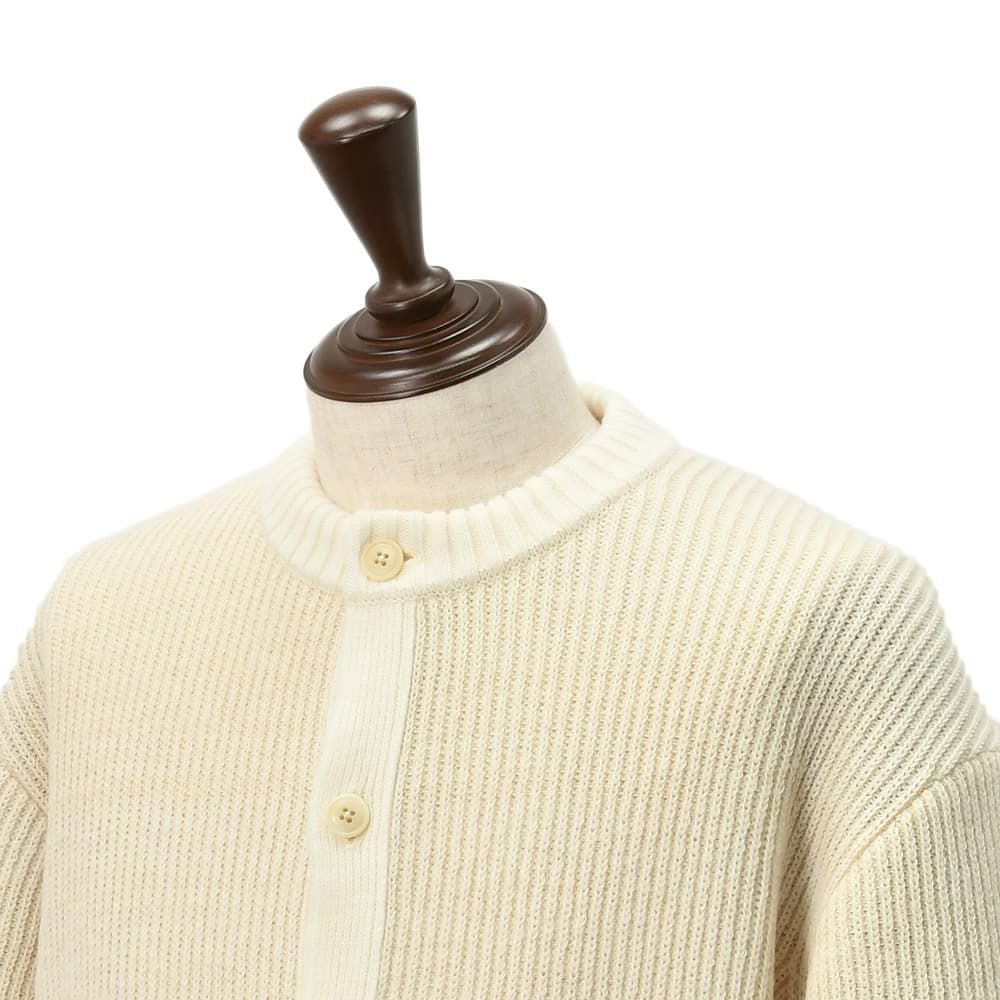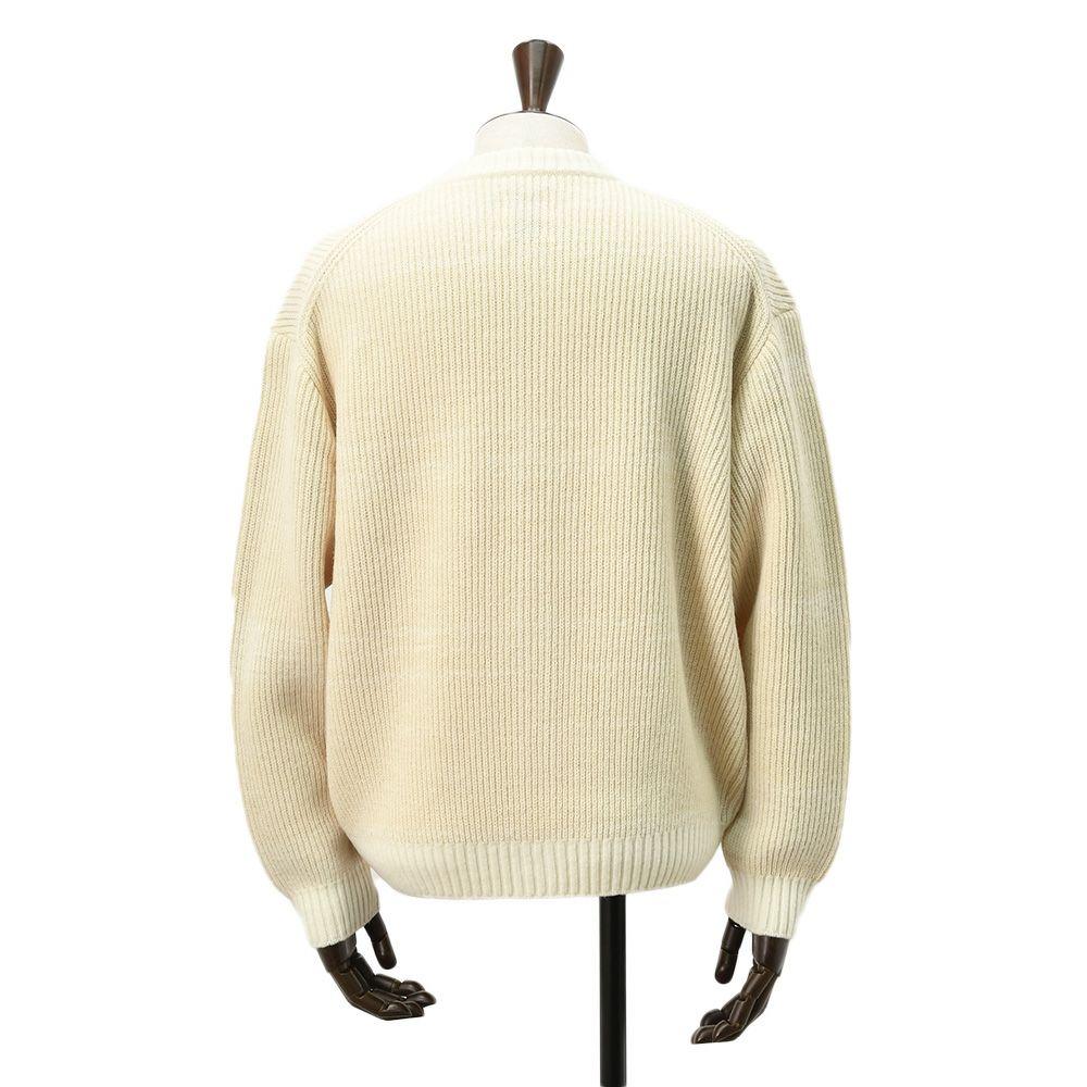 ゆったりとしたオーバーサイズのクルーネックデザインは、首元をすっきりと見せながらも抜け感のある印象に。前立てやリブ部分はウール糸のみで編み、ボディとコントラストを付けたディテールワークが、そっと洗練さを伝えます。