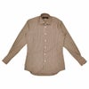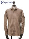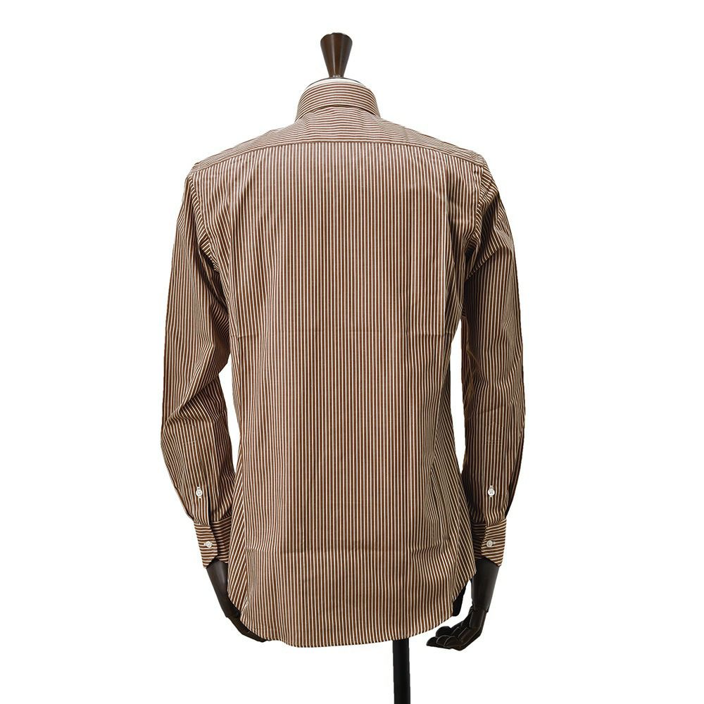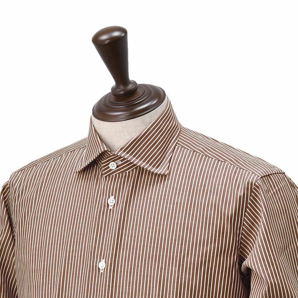 薄手でたおやかな高級感溢れる素材感でありながらも、しっかりと色付いたブラウンとホワイトのストライプ柄により、透け感の心配なくとてもシャープなスタイリングを完成させる事ができるオリジナルシャツです。