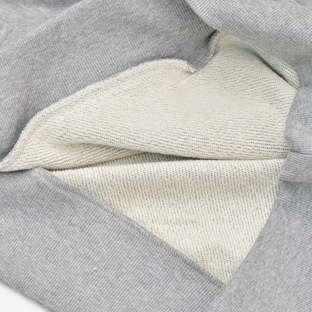 使用されている素材は、上質なコットンを緻密に織り上げたコットンスウェット生地。裏糸に太番の糸を使用して度目を詰めて編むことで膨らみ感があり、さらっとした滑らかな質感を作り出しております。糸の状態と生地の状態の2段階でシルケット加工を施すことで、徹底的に毛羽を取り除き、極上の肌触りを作り出した生地にもご注目下さい。