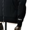 極力副資材を省いた仕様のジップアップパーカーは、さり気ない胸元のシルバーのエンボスロゴや左袖にきらりと輝くアイコンのロゴなども主張し過ぎず、上品な雰囲気に合わせて施されたラグジュアリーなデザインです。ロゴもシルバー光沢のエンボスを使用するなど、とことんエレガントで高級感溢れるディテールを装飾しております。