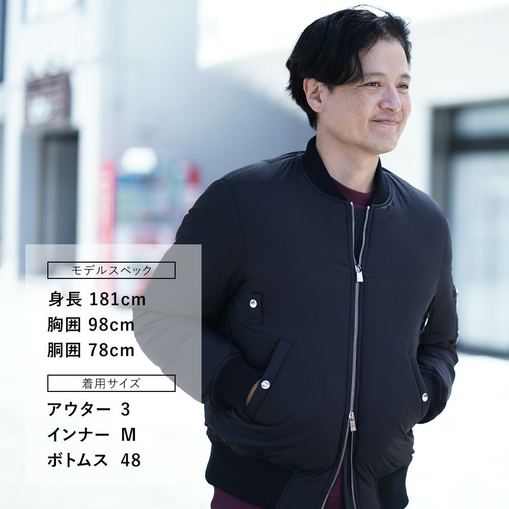 また、MA1らしい短めの着丈は、座ってもコンパクトに収まりが良く、腰の位置も高く見せてくれるので、コーディネート全体をスタイリッシュに魅せつけてくれます。