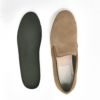 デザインは「GIOIA(ジョイア)」という木型を用いた設計であり、トゥに丸みを持たせたラウンドトゥ仕様であり、絶妙なボリューム感が魅力のスリッポン。シンプルで幅広なレザースニーカーになりますが、ノーズを長くすることにより、可愛らしさを和らげ、エレガントな雰囲気も纏った一足になります。カジュアル感と上品さのバランスを上手く保った立体構築が魅力です。サイドにゴムを挟んでタンからの抑えも完璧で、ラフなスリッポンでも高いフィット感をお楽しみ頂けます。日本人の足に馴染みやすい構築であり、長時間歩いても疲れにくいという実用性にもご注目くださいませ。