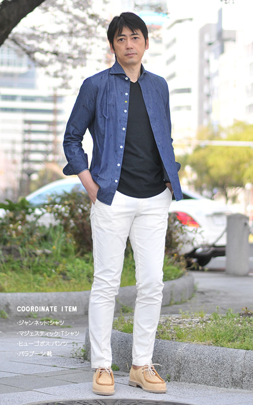 デニム地だったり、シャンブレーだったり、少し厚地の生地のシャツに注目してみてください。