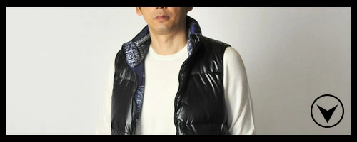 ウエスト部分の縦に長いZIPが印象的なダウンベスト。
