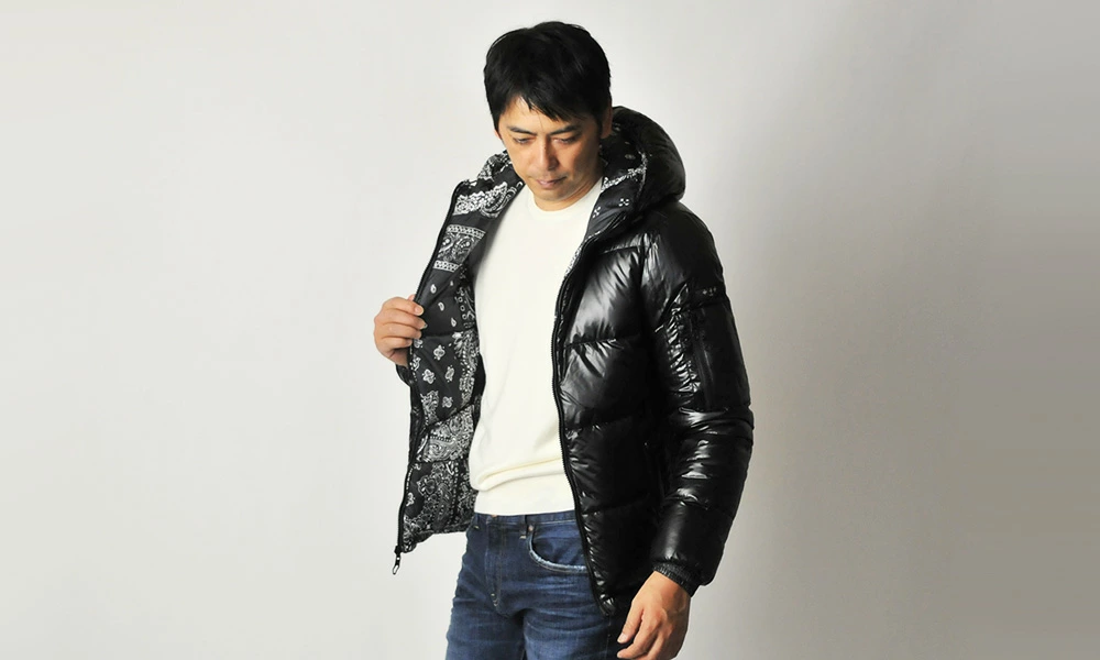 ペイズリーをあしらったバンダナ柄が特徴的なリバーシブルダウンジャケットです。