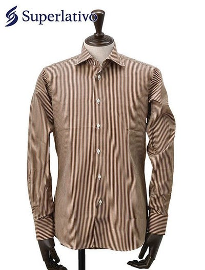 スペルラティボ Superlativo ドレスシャツ メンズ カーブワイドカラー コットンクロス ブラウン×ホワイト ストライプ柄 レギュラーフィット 袖・脇本縫い仕様 当店オリジナルシャツ 日本製のレビューを書く