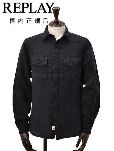 リプレイ REPLAY 長袖カジュアルシャツ メンズ リネン生地 CPO型 ガーメントダイ ブラック 黒 フラップ付き胸ポケット ブランドタグ レギュラーフィット 国内正規品 でらでら 公式ブランドのレビューを書く