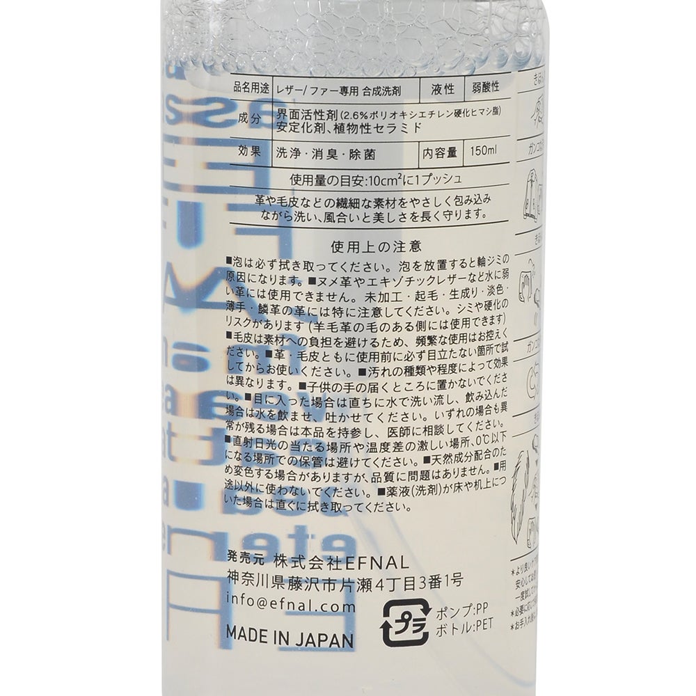 他の画像を見る EFNAL CARE イフナルケア レザー/ファー専用ケア用品 プッシュ型クレンザー 肌にも安心な植物性セラミド使用 水無しで簡単に洗浄・消臭・除菌が出来てしまう泡タイプ 150ml メンテナンスアイテム オクテット名古屋 メーカー希望小売価格 ¥ 3,300 ¥ 3,300 税込 カートに入れる お気に入りに登録する